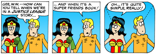 The story behind the joke: the primary visual distinction between the Super Friends series and the rest of the DC line was that the panel borders of the former were rounded, instead of square.